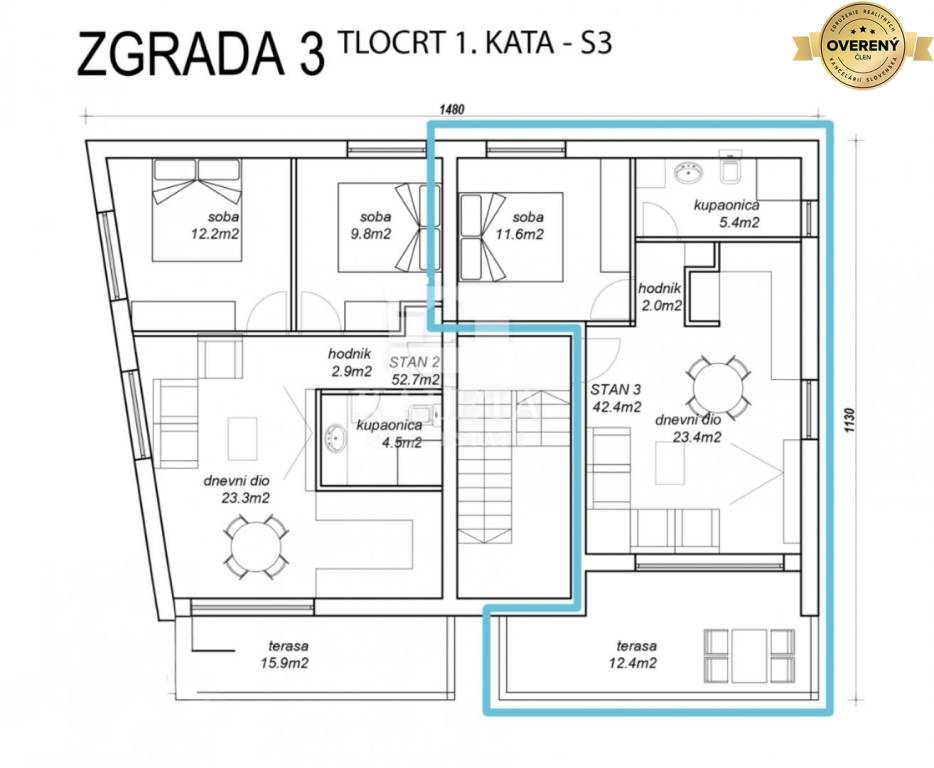 Apartmán Z3S3 sa nachádza na 1. poschodí (dom 3). Výmera apartmánu je 42,4 m2 + terasa 12,4 m2.