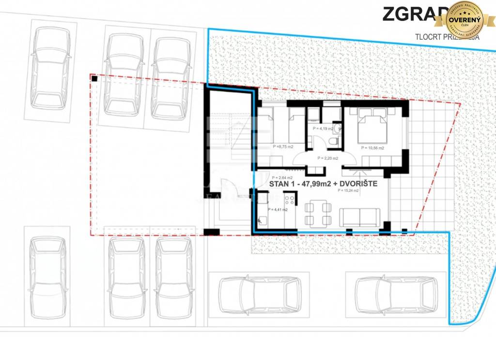 Apartmán Z1S1 sa nachádza na prízemí (dom 1). Výmera apartmánu je 47,99 m2 + terasa s dvorom s výmerou 100 m2.