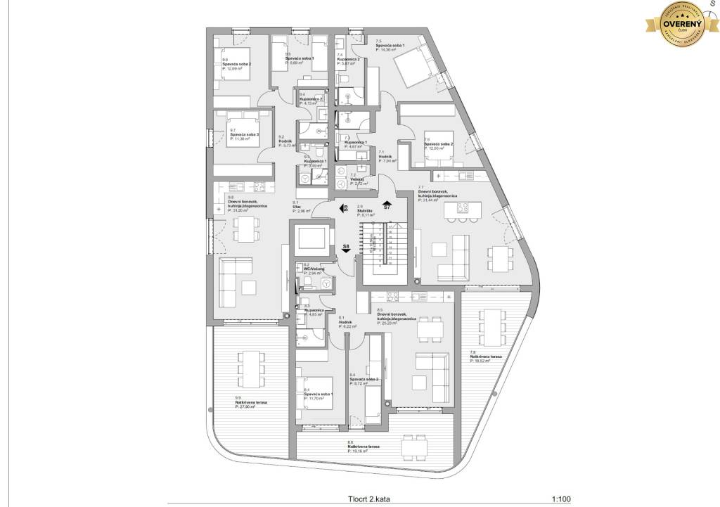 Apartmán S7 – 2.poschodie – výmera apartmánu je 79 m2 + terasa 18,52 m2. Apartmán má vstupnú chodbu, dve spálne, technickú miestnosť, DVE kúpeľne a obývačku spojenú s kuchyňou s prístupom na terasu.
