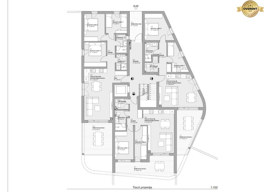 Apartmán S2 – prízemie – výmera apartmánu je 59,74 m2 + terasa 19,57 m2 + záhradka 45,22 m2. Apartmán má vstupnú chodbu, dve spálne s prístupom na terasu, technickú miestnosť s WC, kúpeľňu a obývačku spojenú s kuchyňou s prístupom na terasu.