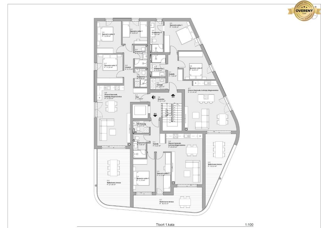 Apartmán S5 – 1.poschodie – výmera apartmánu je 59,74 m2 + terasa 19,16 m2. Apartmán má vstupnú chodbu, dve spálne s prístupom na terasu, technickú miestnosť s WC, kúpeľňu a obývačku spojenú s kuchyňou s prístupom na terasu.