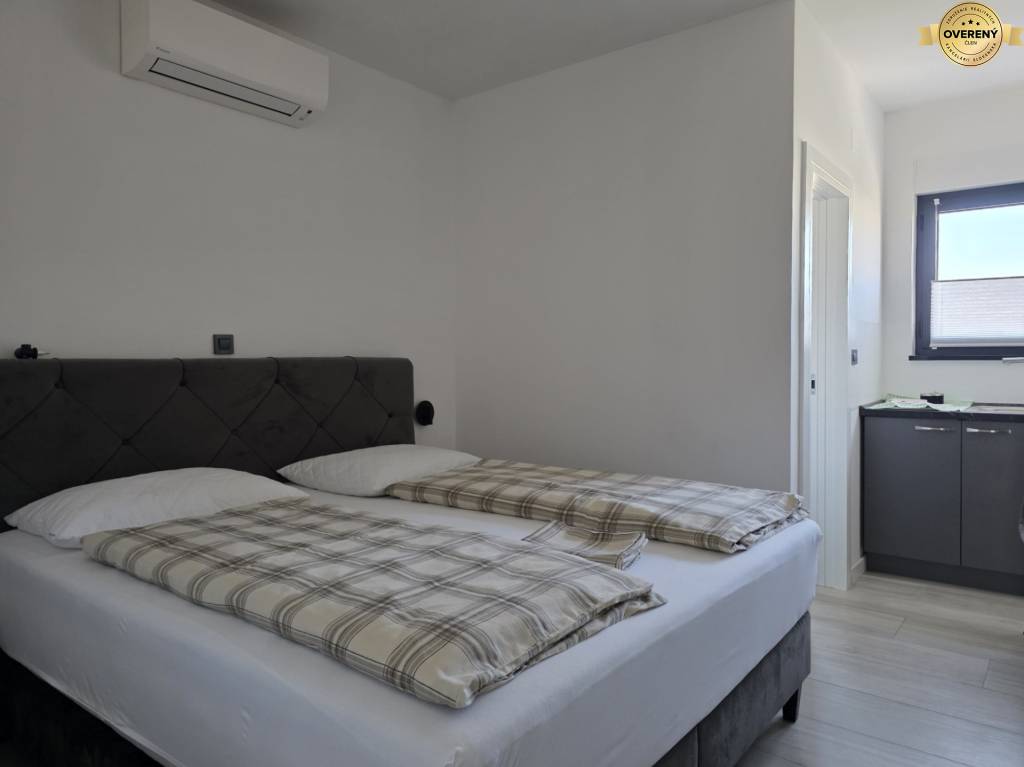 Malý štúdio apartmán A5 má jednu izbu s manželskou posteľou a kuchynským kútom s výmerou 14,25 m2 + kúpeľňu s výmerou 2,87 m2.