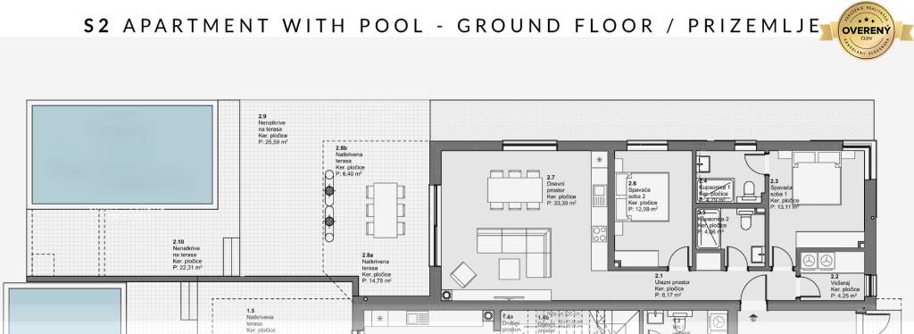 Výmera apartmánu je 80,46 m2 + terasa s výmerou 69 m2, z ktorej časť o výmere 21 m2 je krytá, bazén 23,76 m2 a záhrada s výmerou 138 m2.