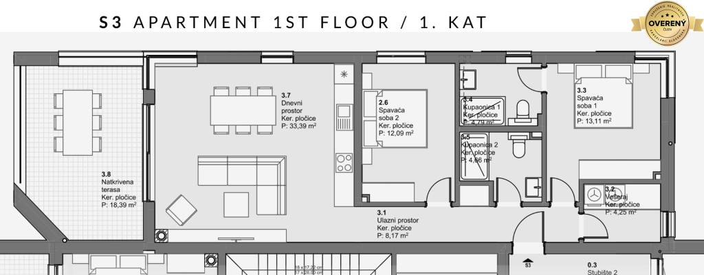 Apartmán S3 – je 3 izbový apartmán na 1. poschodí.