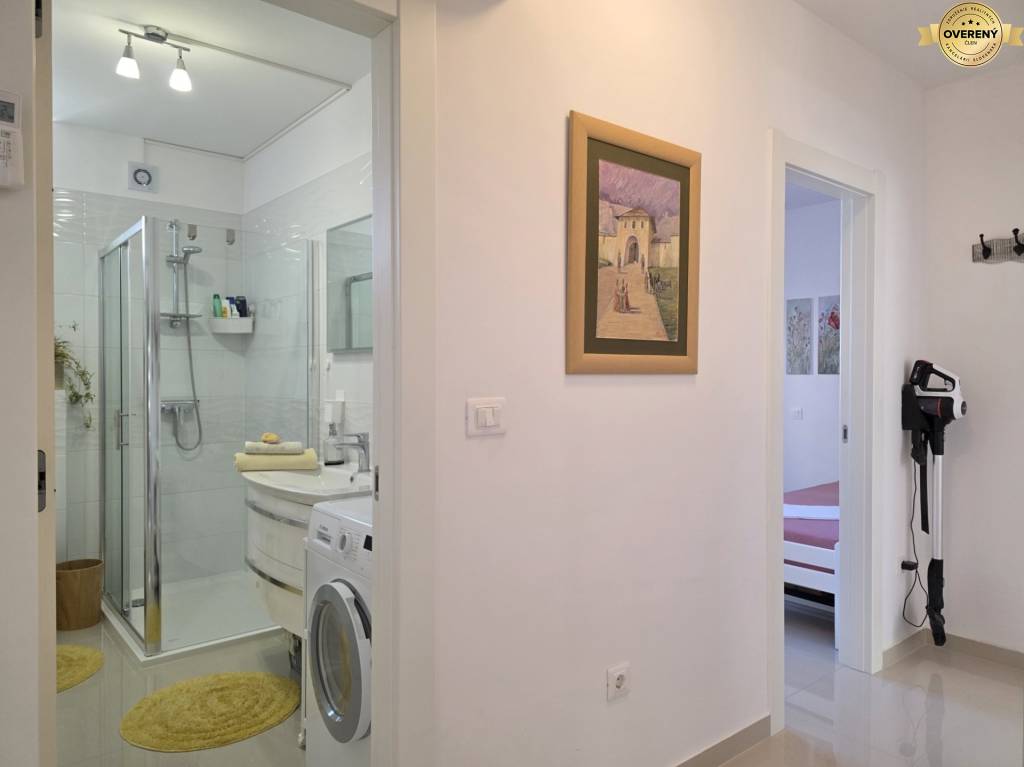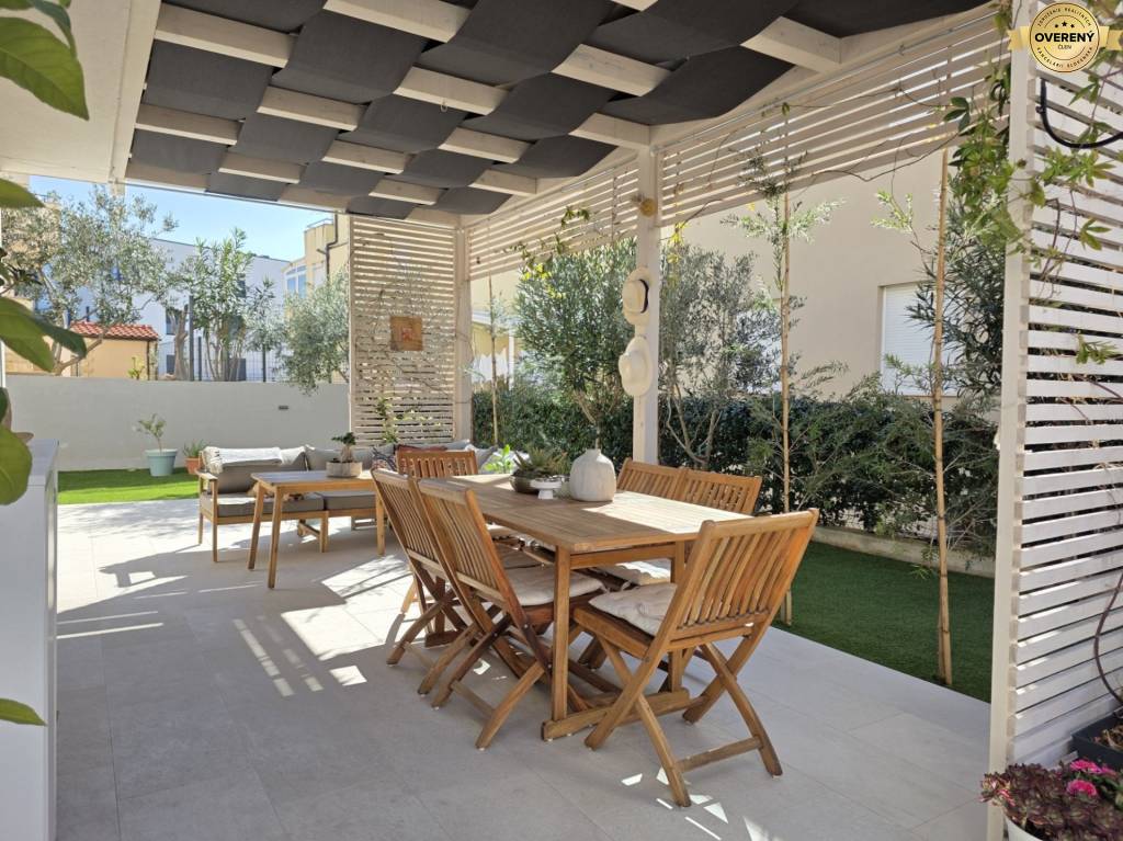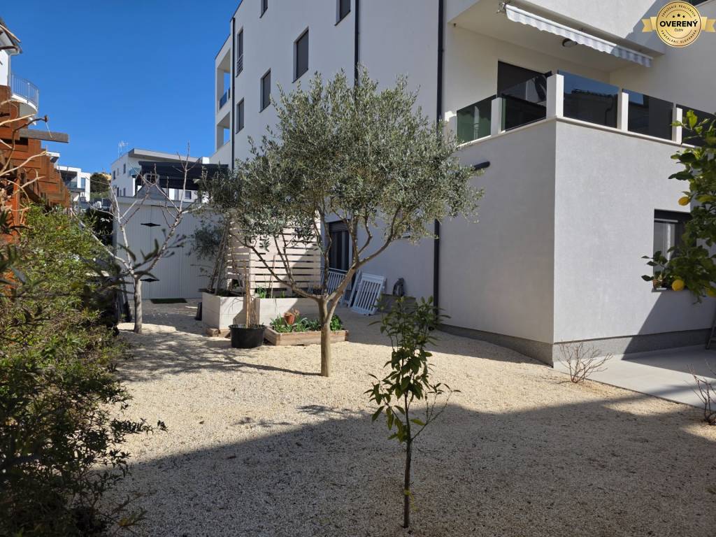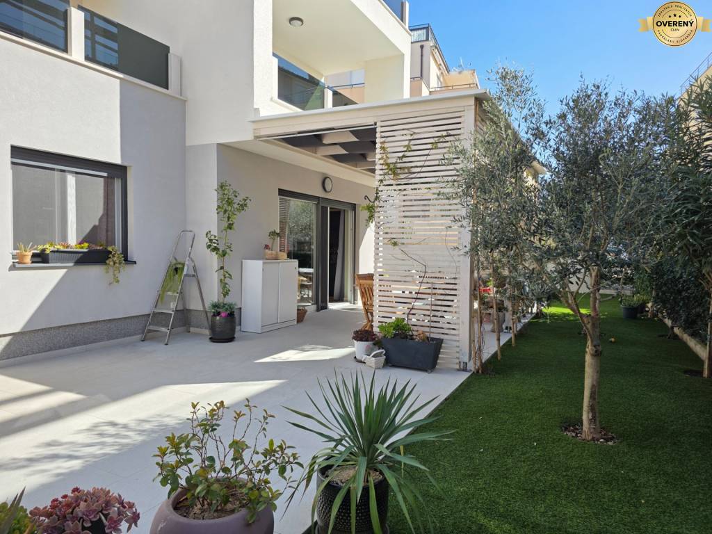 Tento krásny apartmán sa nachádza na prízemí moderného bytového domu. Výmera apartmánu je 75,26 m2. K apartmánu patrí pekná krytá terasa s výmerou 59,26 m2 a záhrada s výmerou 155 m2. Apartmán má navyše ešte pivnicu s výmerou 4,30 m2 a jedno parkovacie miesto.