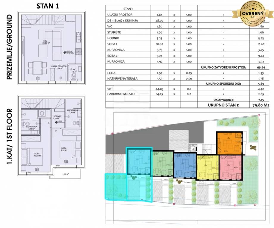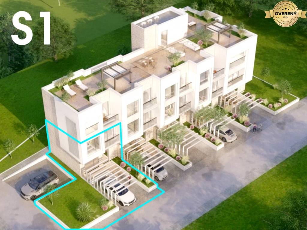 Apartmán S1 má výmeru 66,86 m2 + terasa 5,69 m2 + záhradka 44 m2.