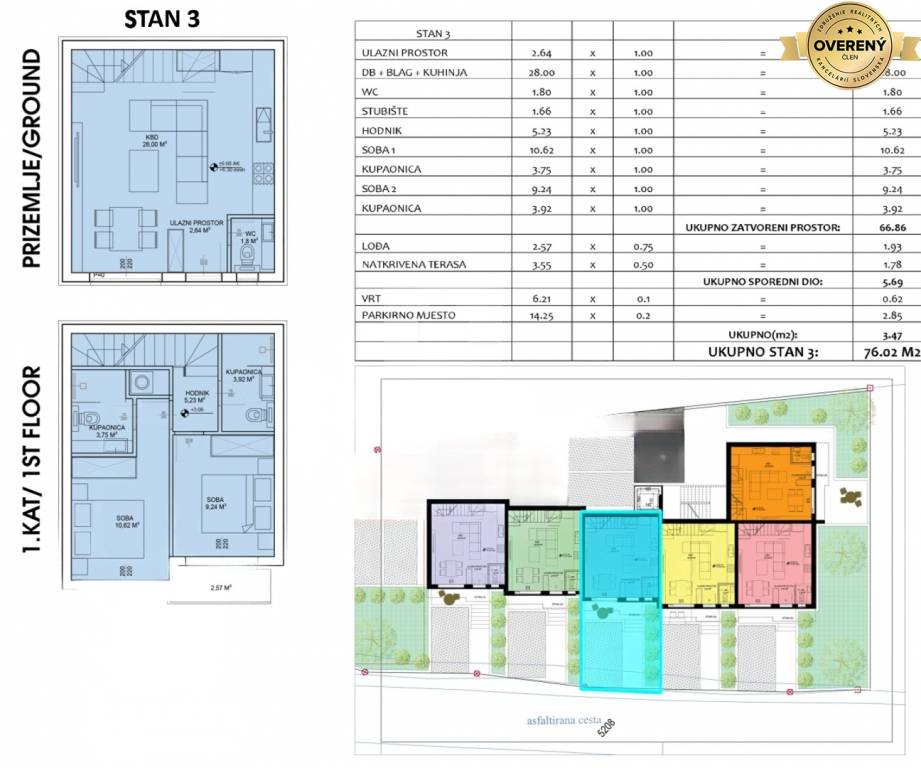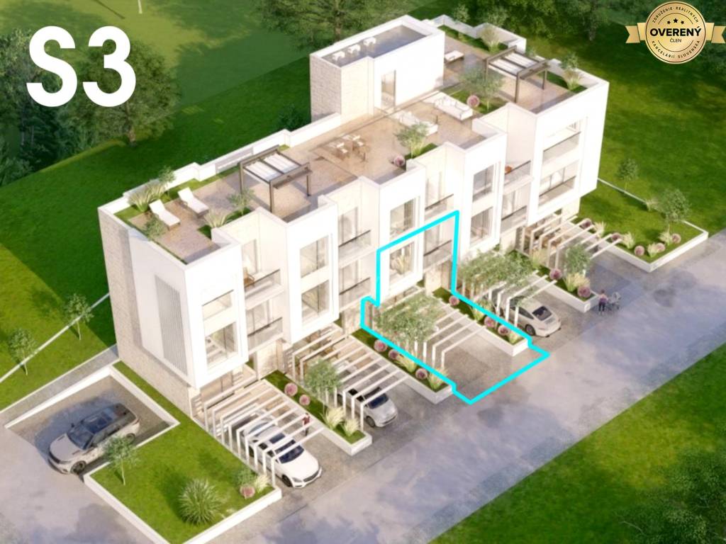 Apartmán S3 má výmeru 66,86 m2 + terasa 5,69 m2 + záhradka 6,21 m2.