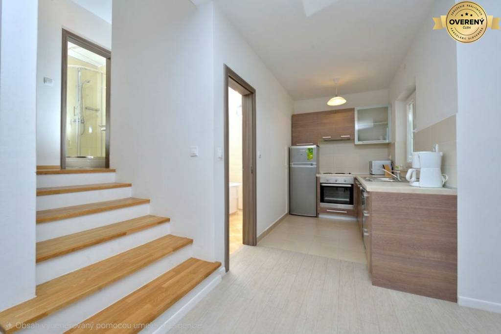 Apartmán má 2 výškové úrovne. Na prízemí je kuchyňa s jedálňou a obývačkou s prístupom na loggiu a kúpeľňa.