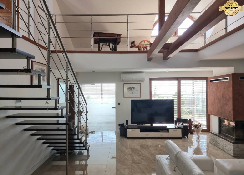 V podkroví domu sa nachádza otvorená galéria s menším fitness, hosťovská izba, šatník a technická miestnosť / kotolňa.