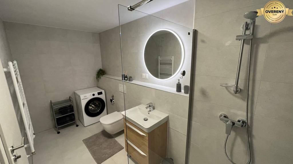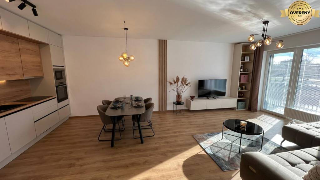 Byt je kompletne zariadený kvalitným nábytkom a vybavený spotrebičmi - práčka, umývačka riadu, rúra na pečenie, mikrovlnka, varná doska, chladnička s mrazničkou, televízor.